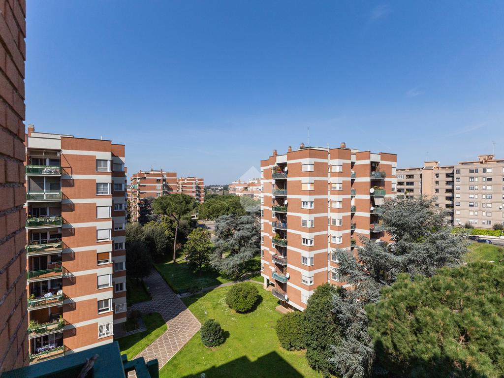 EUR TINTORETTO. In Viale del Tintoretto all'interno di un condominio dotato di servizio di portineria e di ampi giardini, proponiamo la vendita di un appartamento trilocale posto al settimo piano. L'immobile si compone di ingresso, salone, cucina, due camere, un bagno con finestra e balcone con affaccio libero e silenzioso. Completano la proprietà un posto auto coperto e una cantina.